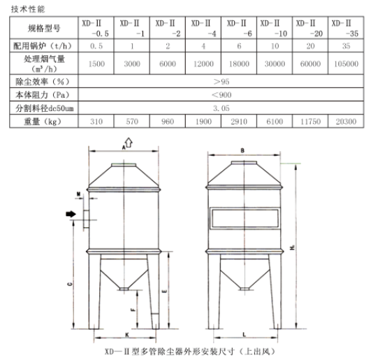 XD—II型多管旋風(fēng)除塵器內(nèi)的旋風(fēng)子是采用鑄鐵或陶瓷制造的,厚度大于6mm,因此有良好的耐磨性能。它是工業(yè)鍋爐煙氣除塵和其他粉塵治理的理想設(shè)備。